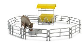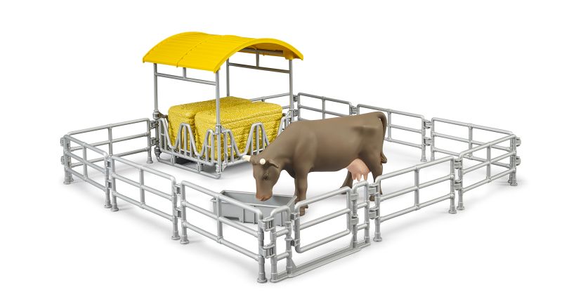 For agriculture fans, there is an expansion set for the already familiar cows, bulls and horses. The hay rack with fences and trough is a modern outdoor facility for these animals and the ideal addition to the existing bworld farming set (item no. 62611). The hay rack can be filled using the slip-on frontloader and bale gripper from Bruder’s extensive agricultural range. The Schäffer compact loader with bale gripper and round bales (item no. 02192) is also a perfect partner for this modern set.One cow is included in the scope of delivery.